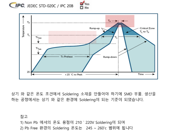 미국. 일본, 유럽 Solder Paste제조 회사들이 서로 다른 방식으로 Pb free 솔더을 만들다 보니 사용자는 매우 혼돈에 빠져, 국제전자제품생산표준협회에서 (IPC)에서 솔더링의 기준을 만들어 모든 Solder paste을 만드는 회사에서는 하기graphic과 같은 온도 범위에서 납탬이 될 수 있는 환경을 표준 하였습니다.